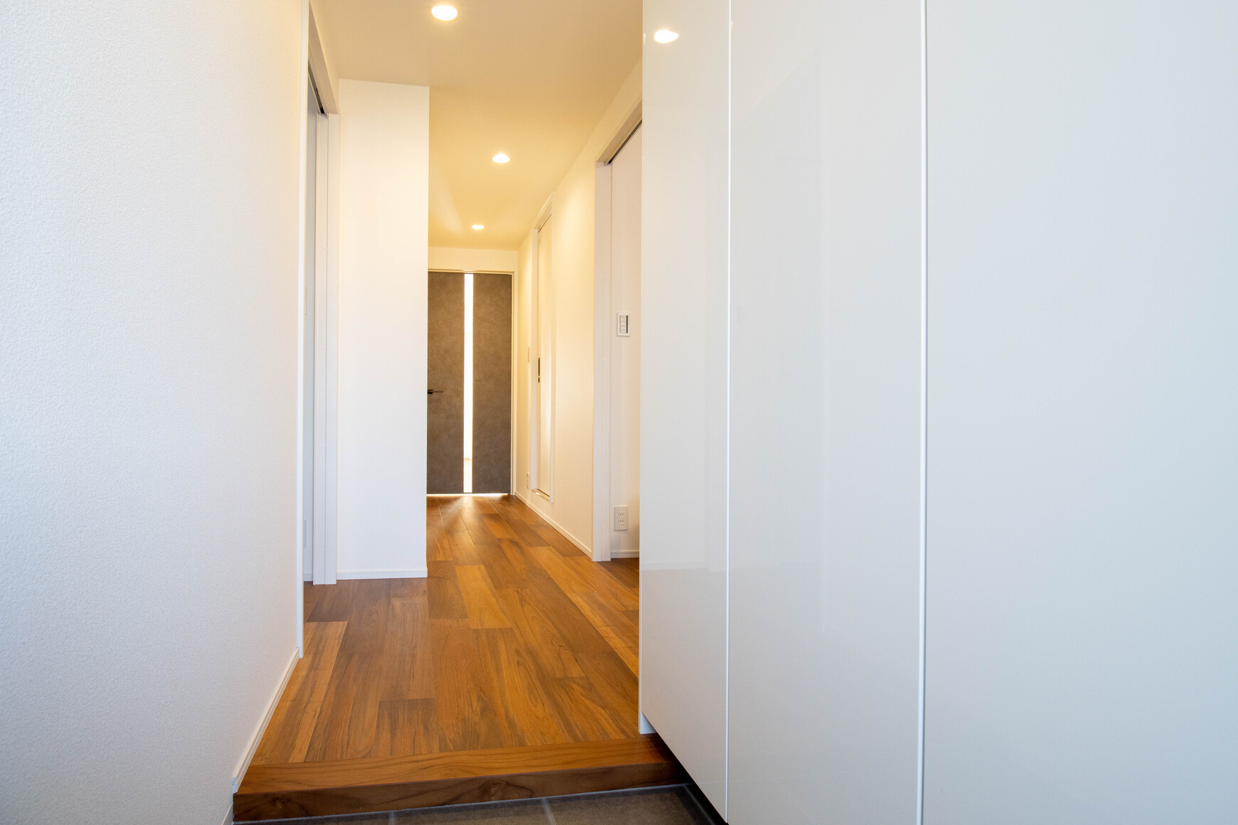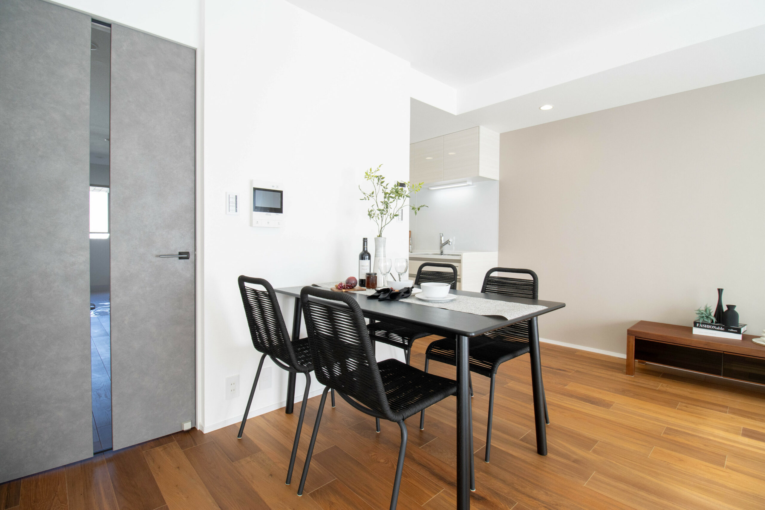高級木材チークの床にグレージュの壁が映える、洗練された空間。