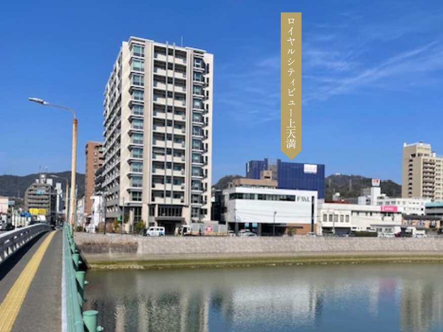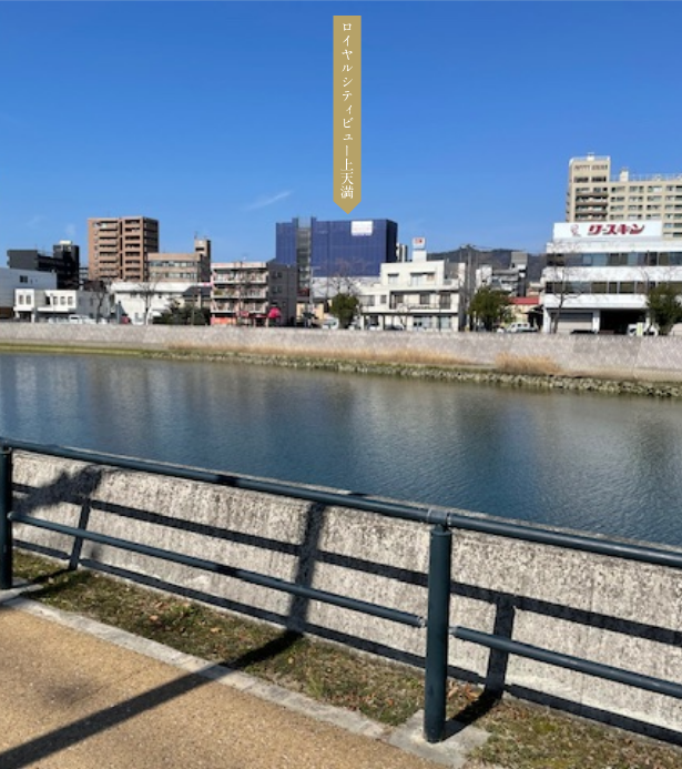 広瀬橋(相生通り)から天満川越しに建設現場を望む。