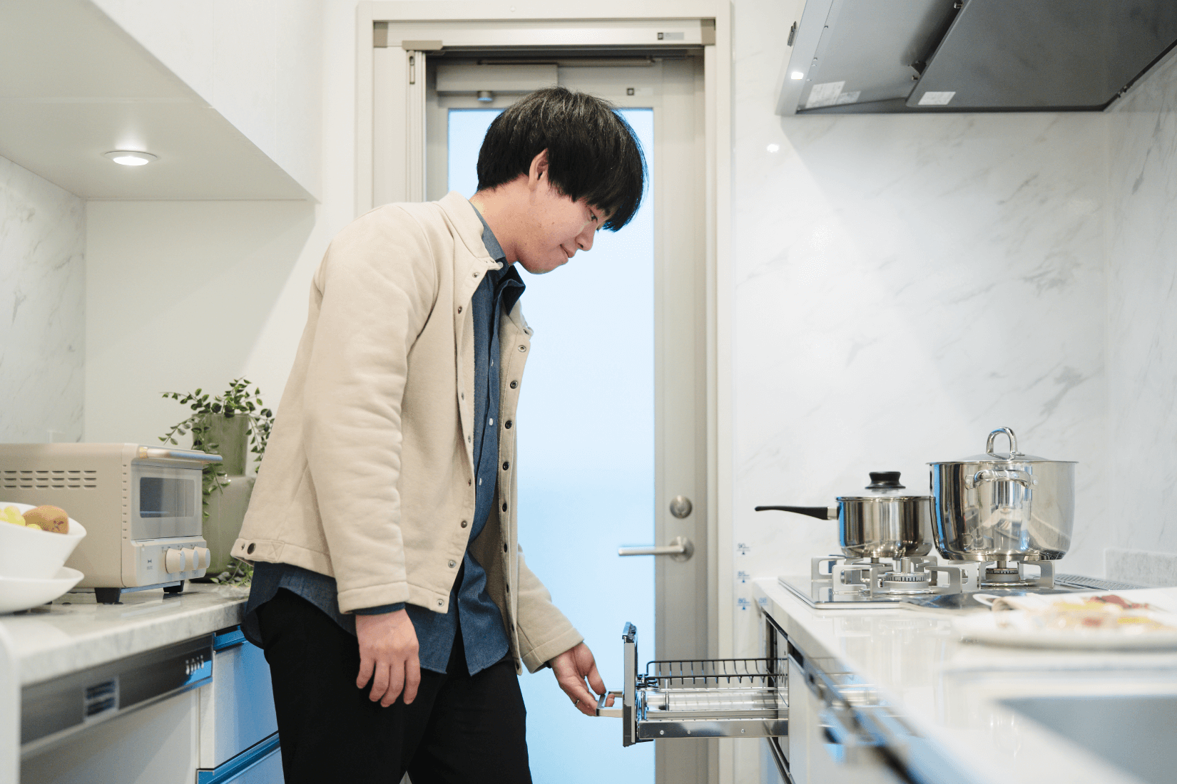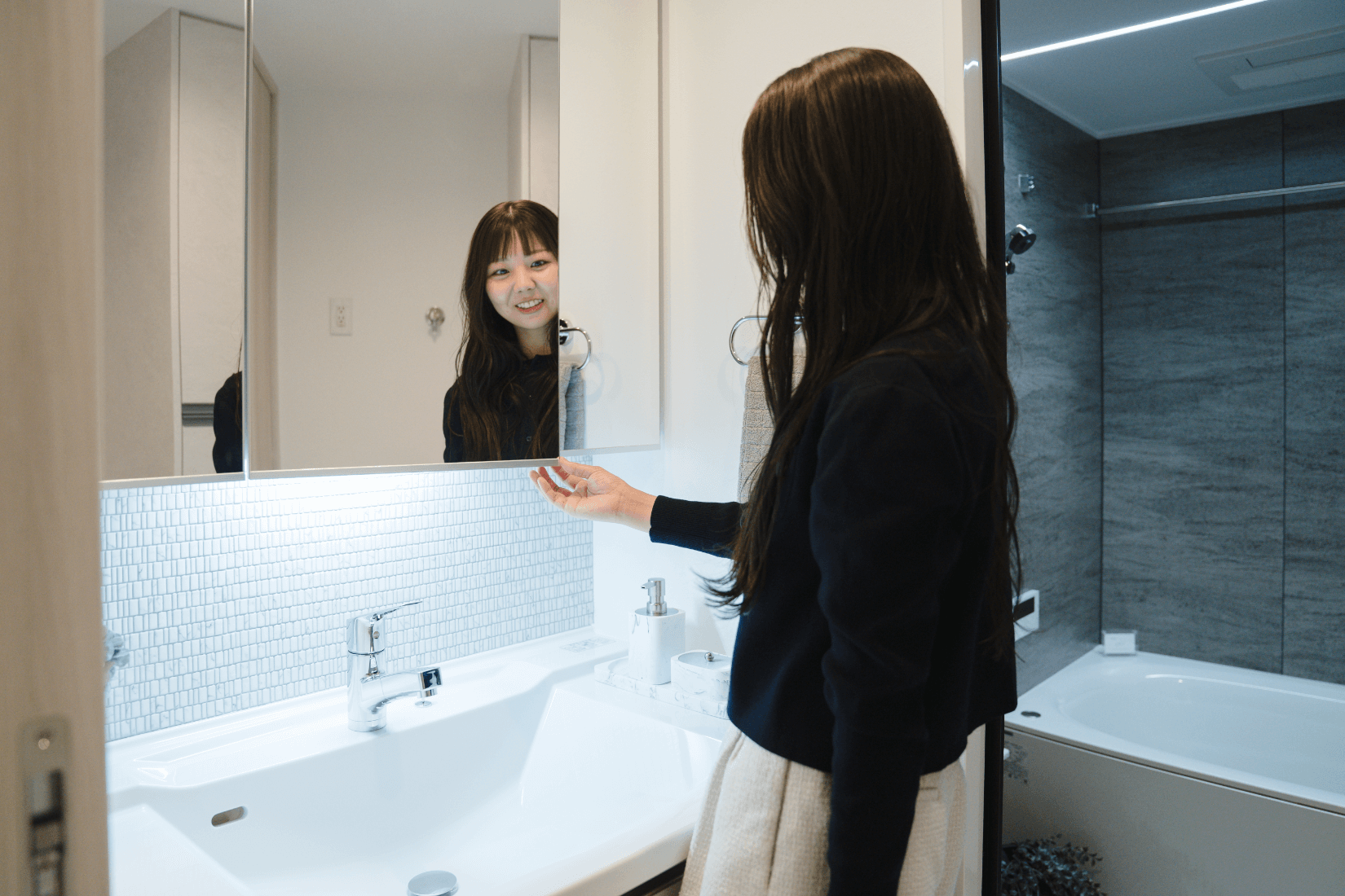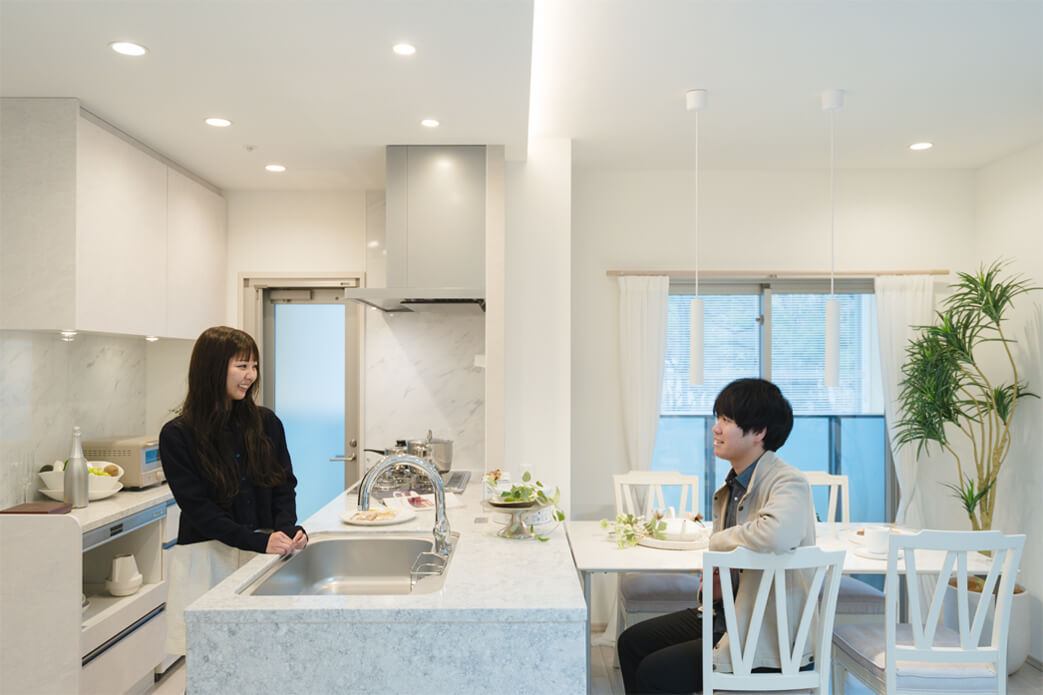 マンションギャラリーを見学してご夫妻が特に気に入ったのが、8.5mワイドスパン設計で明るく開放的なリビングに繋がるバルコニーとキッチン。「マンションは縦長の間取りが多いのですが、ここだとリビング・ダイニングが正方形に近くて使いやすいと思います」とご主人。キッチンにはトップグレードSiセンサー「デリシア」が標準装備されており、「二人とも料理をするので、3口コンロで掃除しやすいのが助かります。料理をするのが楽しくなりそう」と話します。奥様はBタイプの広い洗面室もお気に入りとのこと。「洗面室がゆったりしていて鏡が大きいのも女性には嬉しい」と笑顔がこぼれます。