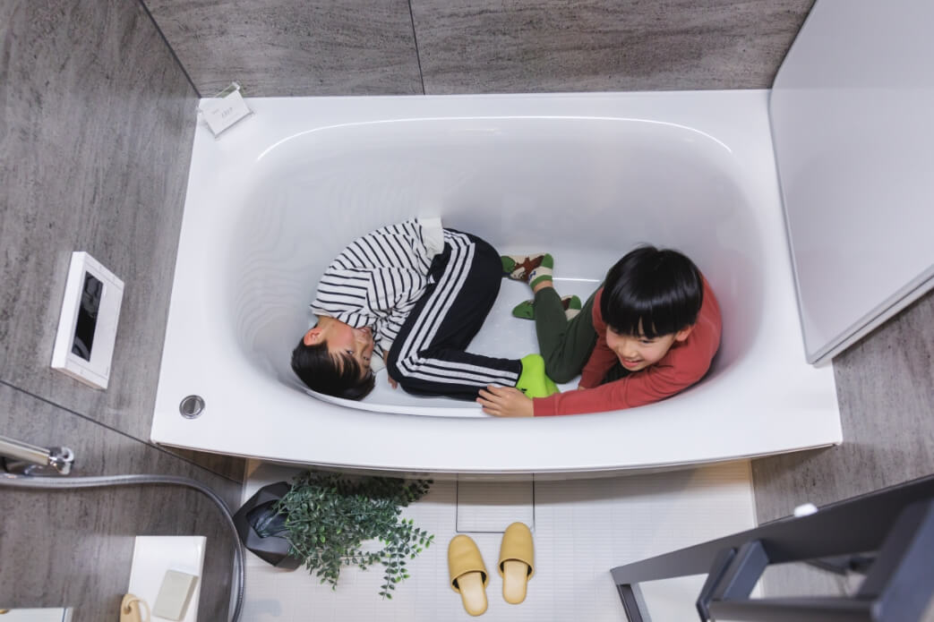 見学で特に惹かれたのは、「広いリビング」とご主人。「家族が集まって過ごせる空間がほしかったので、モデルルームと同じように洋室をリビングに変更しました」。一方で、将来的に子ども部屋を2部屋にすることを考えて、リビングを区切れるように下地を設置。「私たちに合わせた選択やアレンジができたこともメリットでした」と奥様。無償で選択できるカラーセレクトではカームビターを選択し、浴槽形状は弓形をチョイス。食洗機の容量を大きくしたり、キッチンカウンターの高さをセレクトしカップボードを設けたりと、家族の好みやライフスタイルを反映できる点もポイントが高かったと振り返ります。