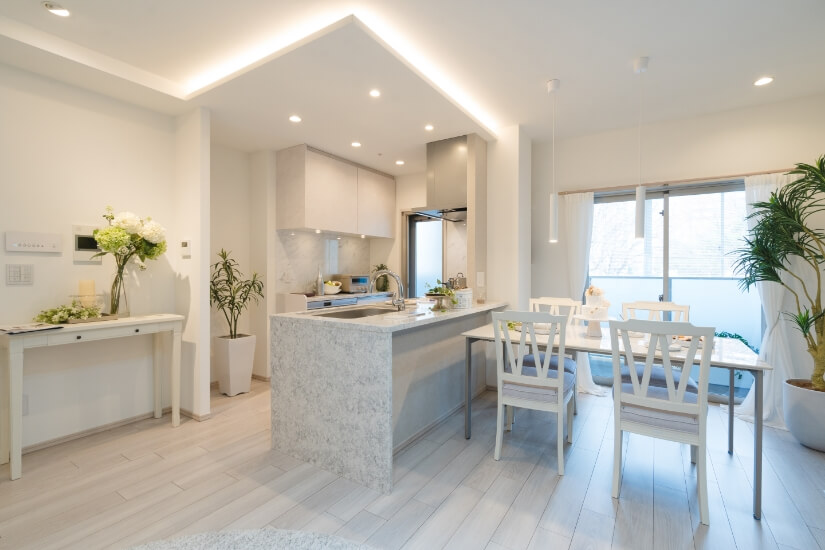 次に利点として挙げたのが、好みやライフスタイルに合わせてプランやカラーを変えられる「ロイヤルセレクトシステム」。N様は一番長く過ごすリビング・ダイニングをもっと快適にしたいと洋室(3)をリビングに変更しました。「どちらかと言えば二人ともインドア派なので、リビングを大きなソファを置いて寛げる空間にしたいと思い広くしました」。他にもダイニングのシーリングライトをダウンライトに変更したり、キッチンをタッチレス式水栓にしたりと、暮らしやすいようにカスタマイズ。「自由度が高いのもこのマンションの魅力の一つ。セレクトでカップボードや扉の色をどれにするか考えるのも楽しかったです」。