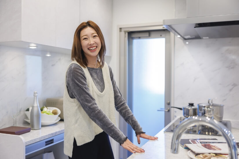 奥様のお気に入りはワイドスパン設計の広々としたバルコニー。「Dタイプは3面バルコニーでスペースが多いので色々な使い方ができそうです。キッチン横の勝手口の近くにゴミ箱を置いたり、リビングに接する全面バルコニーはイスを置いて家族で寛げる場所にしたり、イメージが膨らみますね」。キッチンとダイニング、水回りの効率的な導線も「家事が楽になりそう」と奥様。「リビングが広いおかげでダイニングテーブルがキッチンの正面に置けるので、料理をそのままカウンター越しに手渡せます。ハンズフリーで開錠するエントランスや24時間ゴミが出せるゴミ置き場とか、便利な共有設備も日々のことだから快適なのは嬉しいです」。